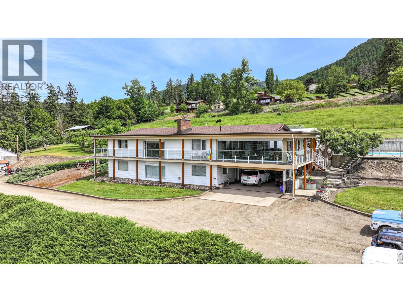 9.45 acre farm property with 4 bed / 3 bath home in the North BX area of Vernon. Enjoy the great valley and lake views from the large sunroom (21'x 25') with floor to ceiling windows. The home has much to offer, 3 bedrms. on the main level with the primary bedroom having a 3 pce. ensuite bath. Country kitchen with island, and a sunken living room with stone fireplace with gas insert. Downstairs is where you will find the 1 bed/1 bath in-law suite with separate entrance. Laund…ry is on this level as well as the mechanical room with the gas boiler for radiant heating of the home. Outside is the 20'x50' inground pool to enjoy our Okanagan summers. Farm buildings include heated/insulated Shop (27'x 54'), heated Greenhouse (12'x20'), Haybarn ( 30'x40'), Machine Shed (24'x28'), Coverall (14'x 37'), fenced Garden area (23'x30') and cattle sort pens with a lean-to. The property is irrigated with Greater Vernon Water (GVW) with 3.01 hectares of allocation. (id:14735)