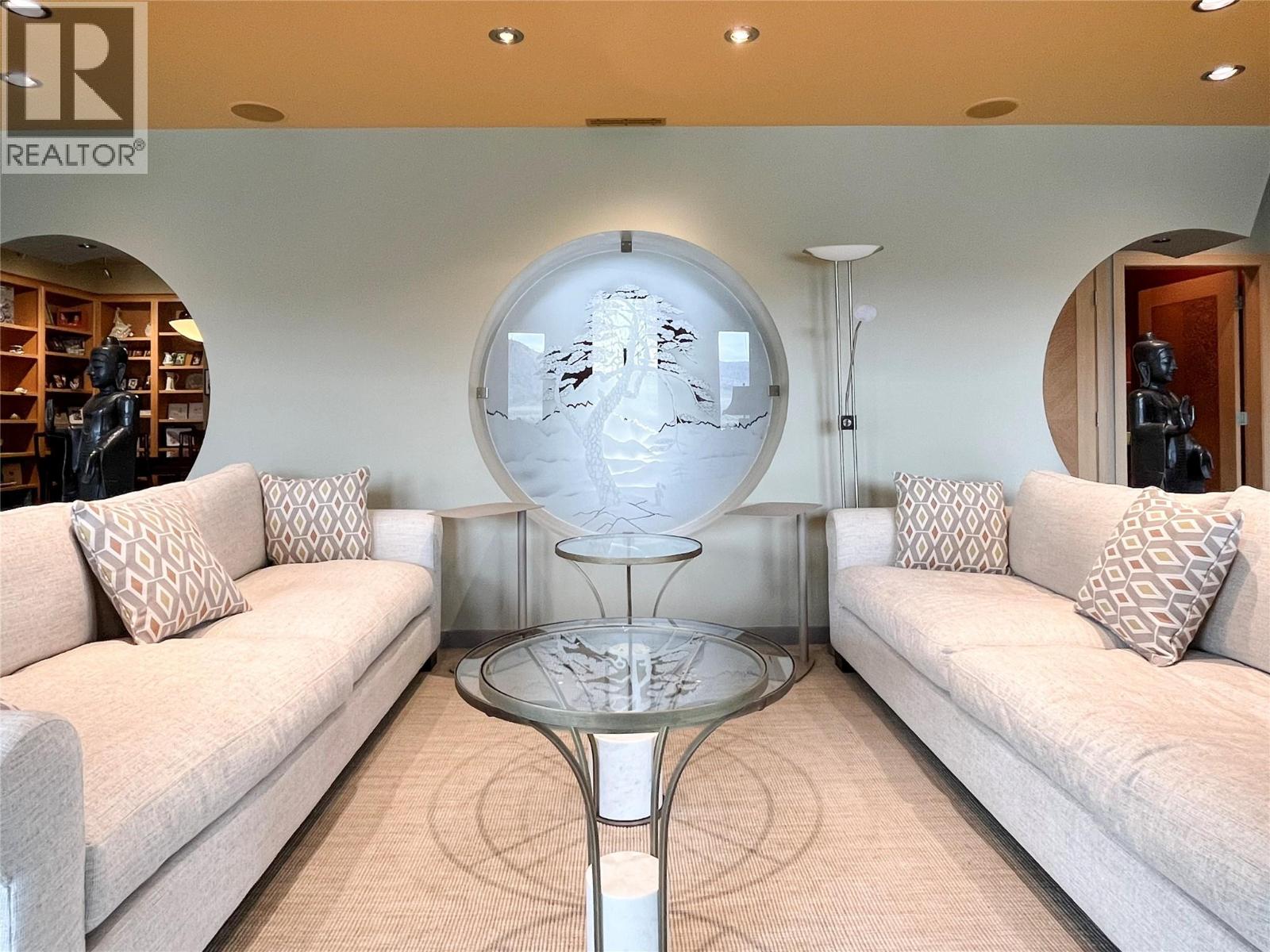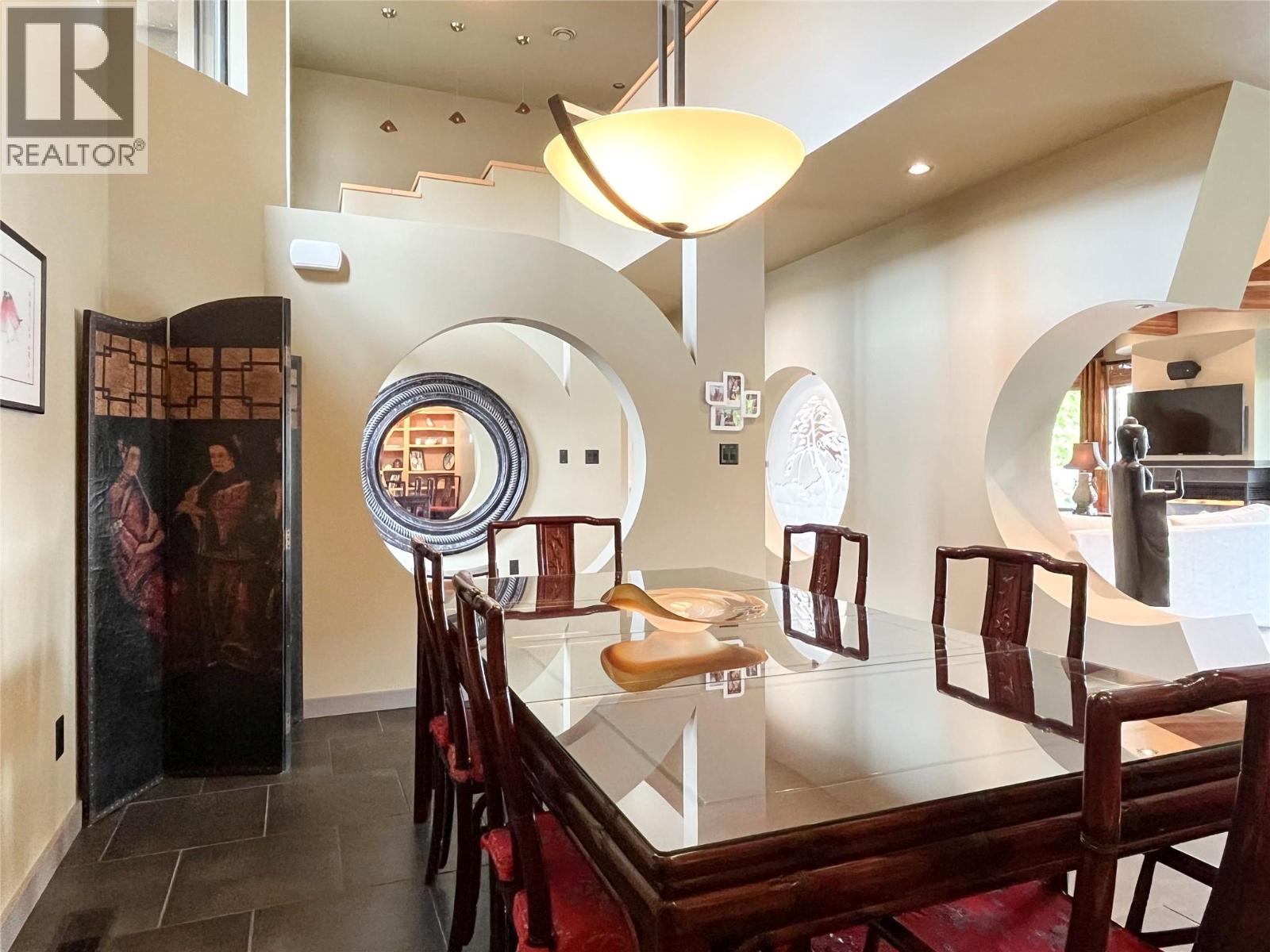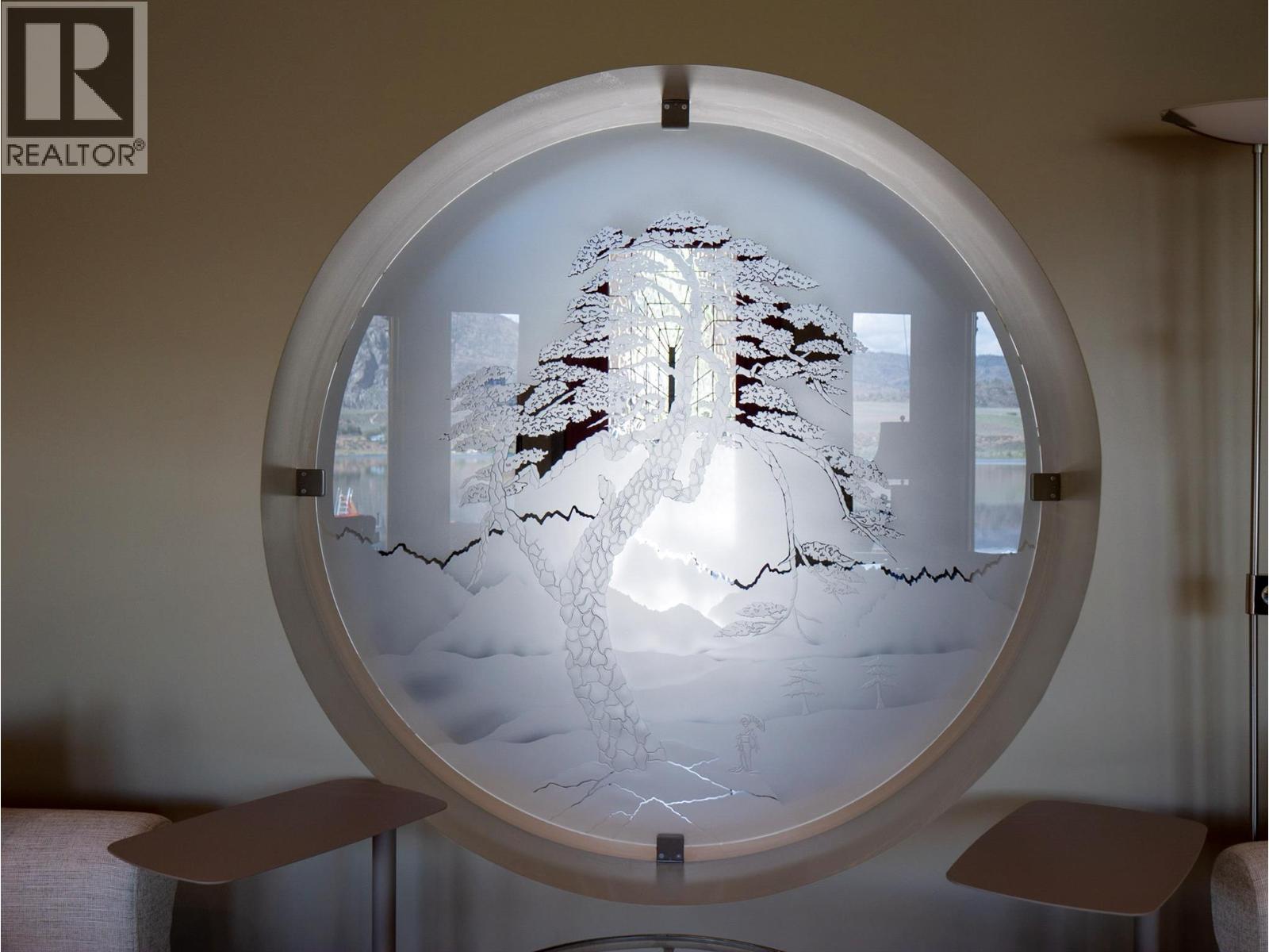 ""The Rising Sun"", a unique architectural masterpiece located on the shores of Osoyoos Lake will definitely captivate your senses. Crafted by the visionary designer Paul Nesbitt, founder of Nesbitt Originals, this extraordinary home is situated on nearly half an acre property with 90ft of waterfront, and it is meticulously aligned along an east-west axis, perfectly harmonizing with the sunrise and symbolizing renewal and balance. The front courtyard features Asian architectu…ral elements that connect the two detached garages to the house with elegant arches and columns. The livingroom has a sun-shaped ceiling, exposed beams, circular drywall accents and hand-sculpted glass accents. Inside, a cozy gas fireplace paired with an outdoor wood-burning fireplace add warmth to the whole home. The central geothermal system with radiant in-floor heating and cooling ensures total comfort. The master bedroom has his and her ensuites and walk-in closets, while the upper loft has two guest bedrooms with ensuites. The property is fully fenced and features a circular driveway, a central zen garden and electronically controlled gates. The 2 detached garages also feature in-floor heating and wall heat pumps. The rear yard includes a pebbly beach and a portable boat dock. Celebrated for its Asian-inspired design and unique architecture, ""The Rising Sun"" has been featured in Best Home Magazines, standing out as a true gem in the South Okanagan. Full Info package available upon request. (id:14735)