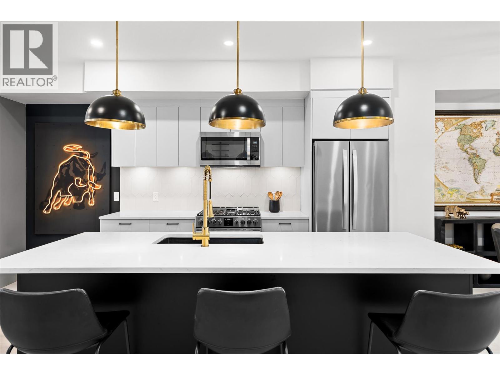 $75K in updates elevate this modern 3 bed/ 3 bath townhouse in The Nest at Findlay, ideally tucked into a quiet area of Rutland North with future development planned nearby. The open-concept main level features updated flooring, a statement kitchen island unique to the unit, upgraded lighting and plumbing fixtures, added blinds for privacy, and a gas range that anchors the kitchen as a true gathering space. The home showcases a sleek, masculine colour palette throughout and a… thoughtful three-level layout with living spaces on the main, all bedrooms on the upper floor, and direct access to the attached double-car garage below - complete with EV chargers. On the upper level, the spacious primary bedroom offers a walk-in closet and a beautifully upgraded ensuite with heated floors, complemented by two additional bedrooms and a full bath. This newer build is ideally located close to transit, the highway, and the airport, blending quiet residential living with everyday convenience. Opportunities like this don’t last - contact our team today to book your private viewing today! (id:14735)