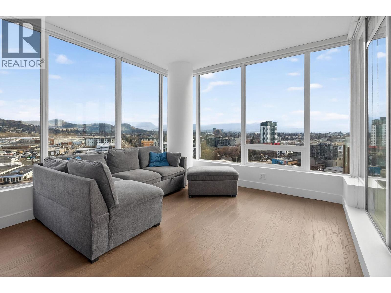 Downtown Kelowna. With a view to the east mountains and south/west overlooking Prospera Arena, the City lights, lake and bridge. The deck offers you a front row seat to view all the activities below you. Floor to ceiling windows flood the space with natural lights. Open concept is anchored by a modern kitchen, featuring quartz countertops, full height custom cabinetry and stainless appliances. 2 bedroom, 2 bathroom corner unit. Primary bedroom has 3 piece tiled walk-in shower and a spacious walk-in closet. Room off entry adds practical storage or office. Ownership gives you access to 2 pools, hot tubs, fitness center, yoga, steam room, pickleball courts, car wash, & Pilates studio, outdoor BBQ, fire pits, guest suites. Front door concierge service. Separate storage locker on floor 2. Parking is on 1st floor, accommodates a large truck. Downtown living doesn't get any better than this. Leave your car and walk to the restaurants, cultural districts, boardwalk, and the beaches on Lake Okanagan Lake. (id:14735)